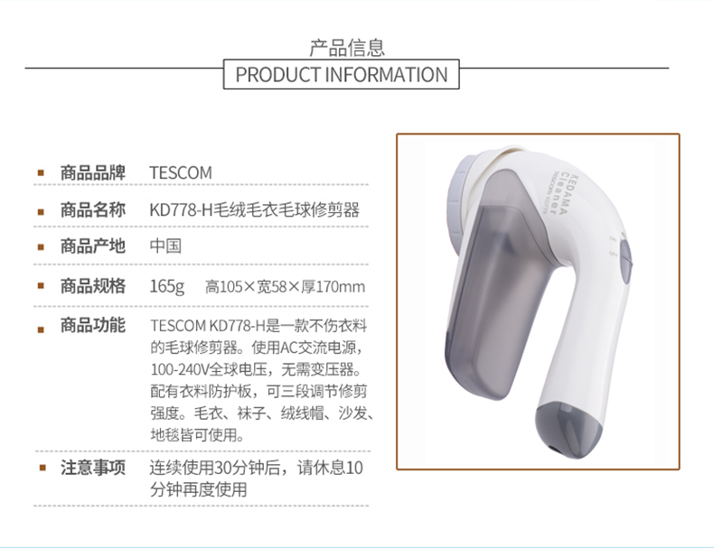 泰思康TESCOM 毛衣毛球修剪器 KD778-H